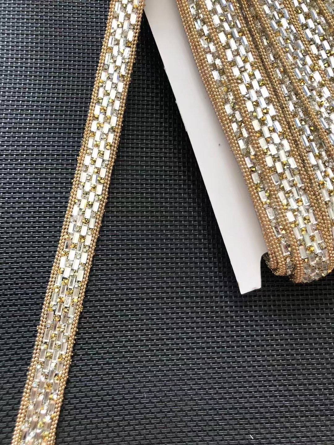 Hot fix rhinestone ribbon are made by rhinestones, crystals, resin beads, pearls, rhinestone cups, metal chains, chaton crystals, etc.
