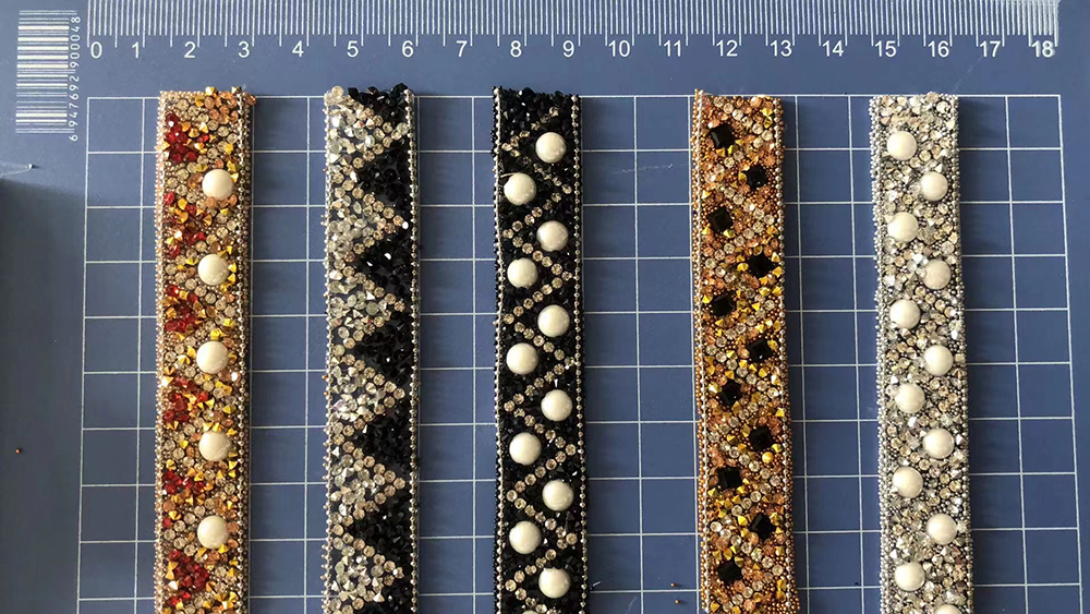 Hot fix rhinestone ribbon are made by rhinestones, crystals, resin beads, pearls, rhinestone cups, metal chains, chaton crystals, etc.