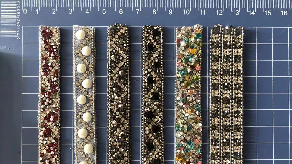 Hot fix rhinestone ribbon are made by rhinestones, crystals, resin beads, pearls, rhinestone cups, metal chains, chaton crystals, etc.